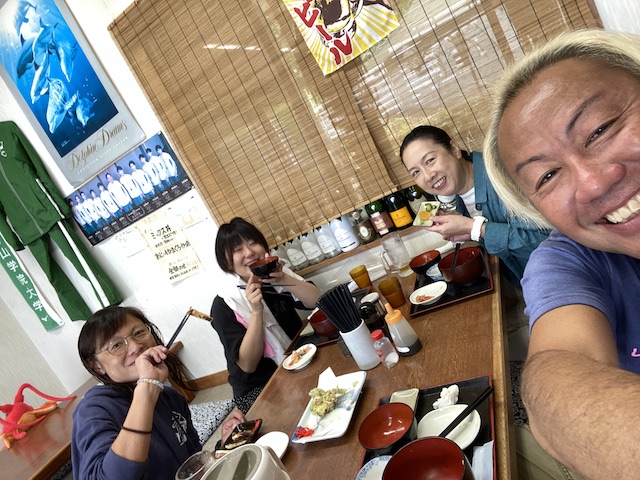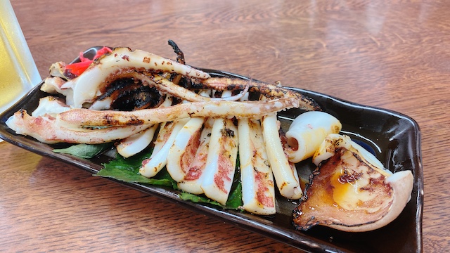 海鮮 イカ丸焼き 明日葉のかき揚げでかんぱーい