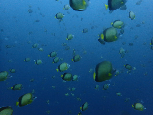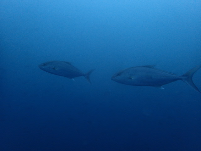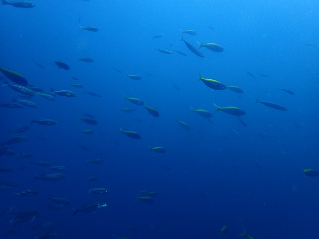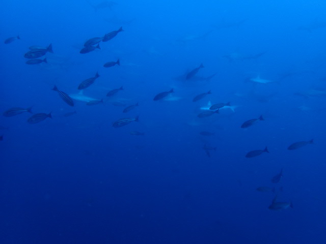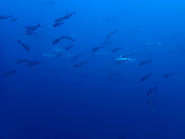 イサキ、タカベ、ムロアジ、タカサゴ、カンパチ、カマストガリザメ、オオセ、ムレハタタテダイ、シラコダイの群れ、ハンマー単体